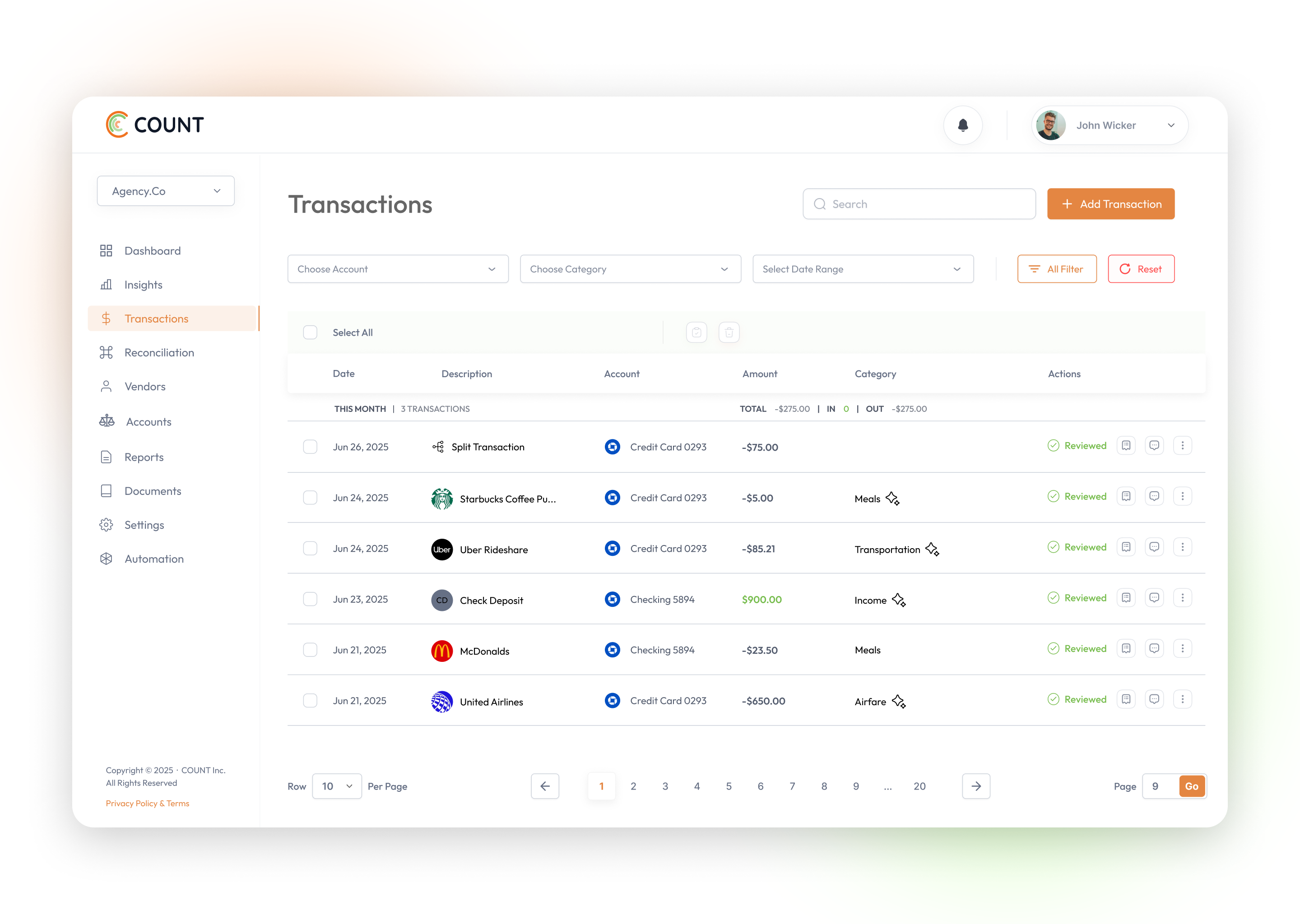 Up to 95 % accuracy out of the box - COUNT learns your vendors and patterns to auto-code new transactions, getting smarter every day so you spend almost no time tagging.
